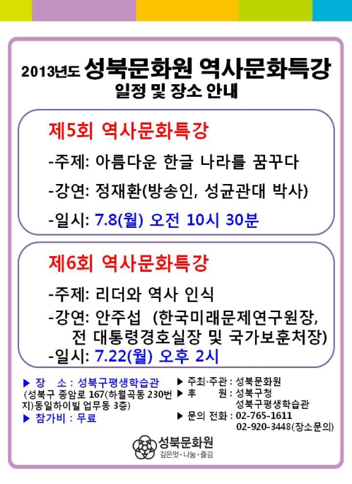 안녕하세요 성북문화원에서 역사문화특강에 여러분을 초대합니다.
